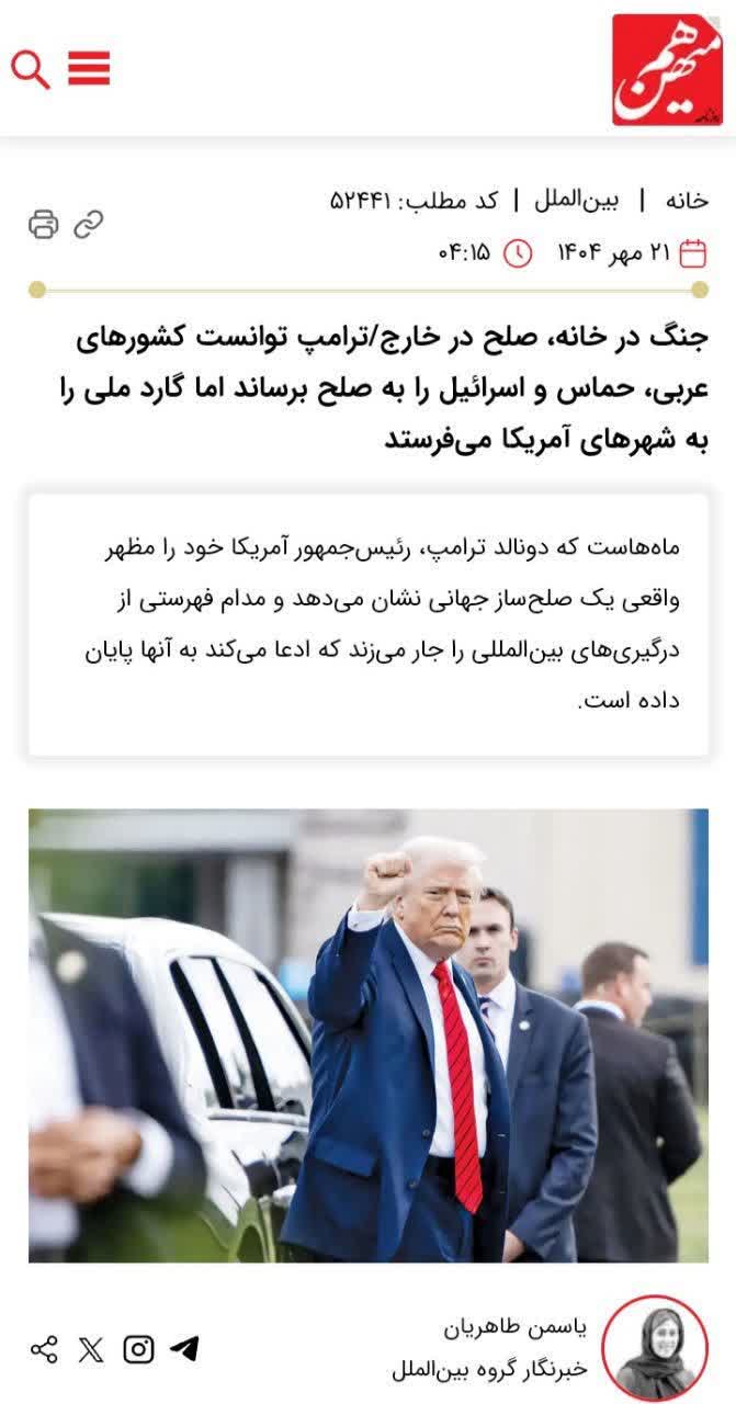 شعار اصلاح طلبان پس از۸۸: “دموکراسی در خانه، صلح در خارج” بود؛ این روزها روزنامه ای اصلاح طلب درباره ترامپ در آمریکا و خاورمیانه تیتر زد: “جنگ در خانه، صلح در خارج”!